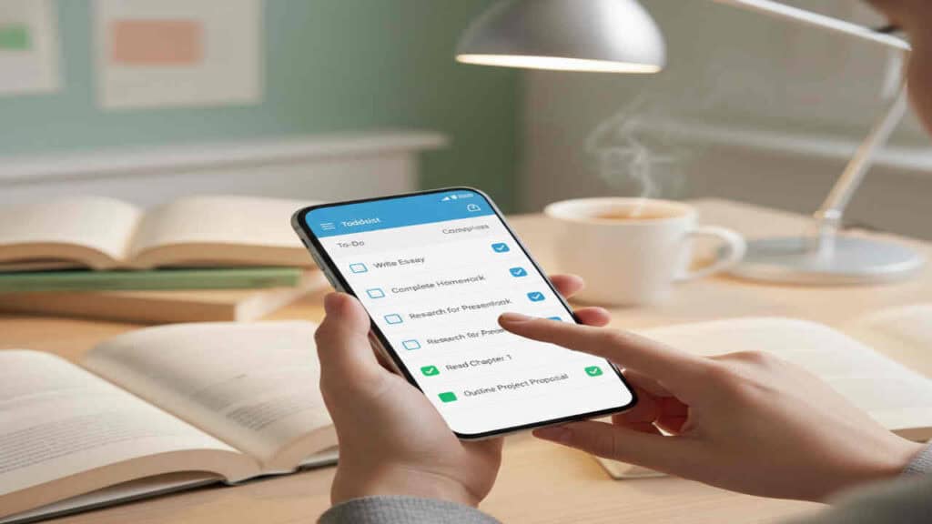 Image Prompt: A close-up of a smartphone screen displaying a task management app like Todoist or Trello, with a student organizing tasks. The background should show a well-organized study space, with a notebook and a cup of tea nearby.